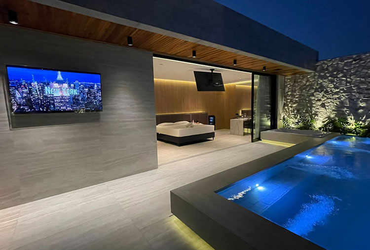2 smart TVs, Alexa, ambiente com 104m², ar-condicionado, área externa, canal erótico, ducha quente, frigobar, garagem automática para 2 carros, hidromassagem, mesa para refeições, Netflix, piscina aquecida, YouTube